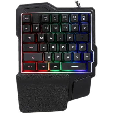 The K7 One-Handed RGB Gaming Keyboard provides a 35-key interface for FPS and MOBA titles. An integrated wrist rest stabilizes the hand during long sessions. This membrane switch system operates via a non-detachable USB 2.0 cable.