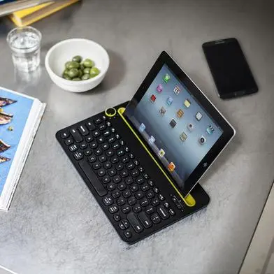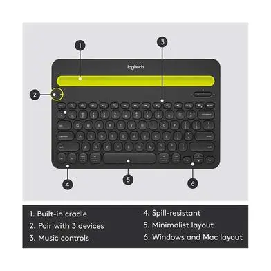 The Logitech K480 connects to three devices simultaneously via Bluetooth using a physical selection dial. A 258 mm wide integrated cradle holds tablets and phones at a fixed typing angle. Membrane keys provide a quiet response for desk use during load shedding or quiet office hours.